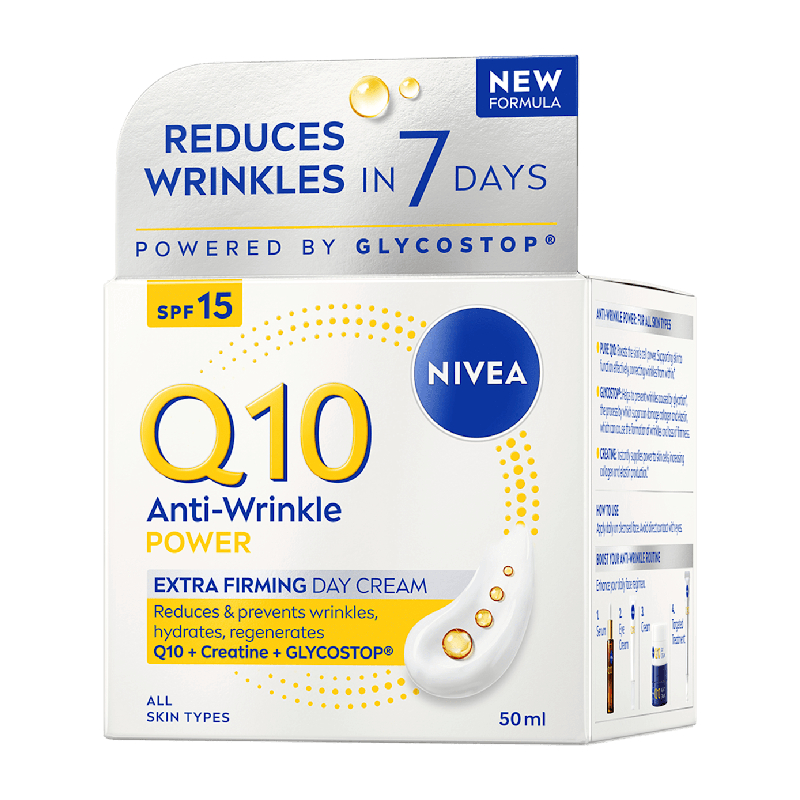 NIVEA Q10 Power Anti-Wrinkle + Firming dnevna krema donosi poboljšanu formulu protiv bora i starenja kože. Jedinstvena kombinacija sastojaka aktivno se bori protiv starenja i vidljivo smanjuje bore u roku od 4 nedelje. Napredna formula sa koenzimom Q10 i kreatinom stimuliše proizvodnju sopstvenog kolagena u koži, što smanjuje postojeće bore i sprečava nastanak novih.